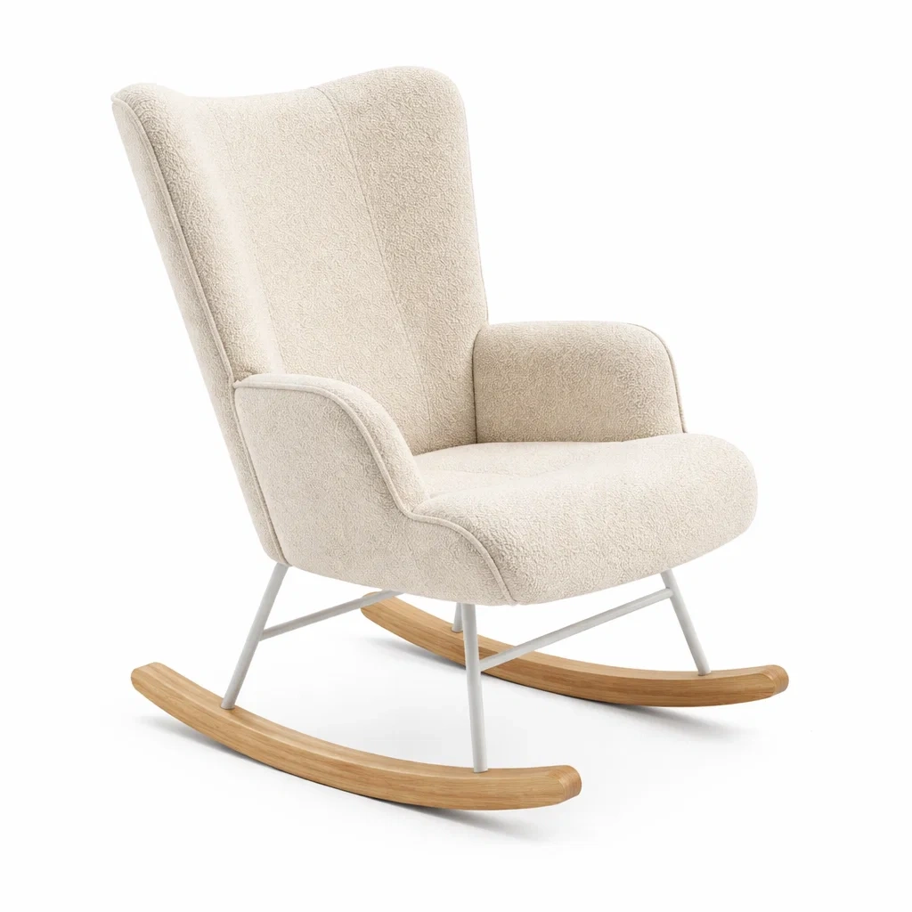 Sedia a dondolo in Tessuto Bouclé con Struttura in Metallo e Legno