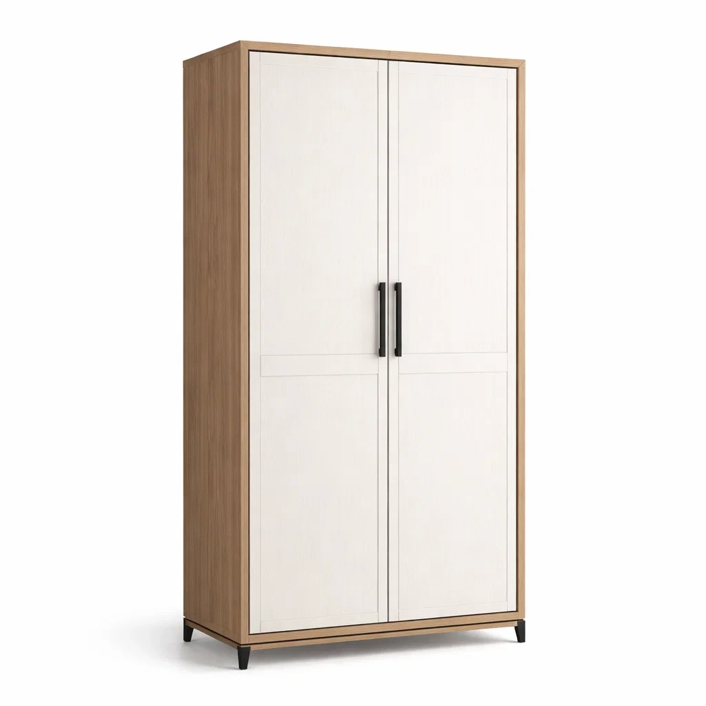 L'armadio è realizzato in legno MDF con una finitura bianco e rovere, dotato di due ante e maniglie in metallo nero.