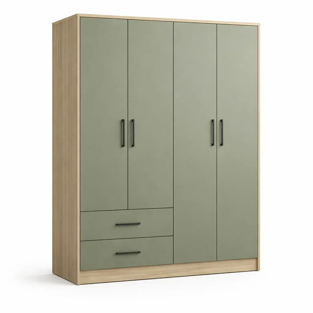 Comprende 4 ante a cerniera, 2 cassetti e spazi per appendere. Ripiani interni regolabili.